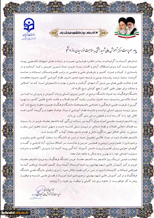 امتیاز دهید : پیام سرپرست مرکز آموزش عالی شهید بهشتی به مناسبت روز دانشجو 2 چهارشنبه 17 آذر 1400 ساعت 9:43