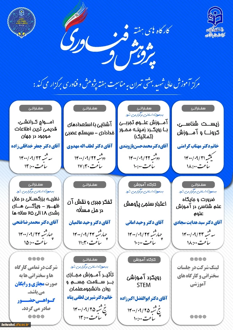 امتیاز دهید : کارگاههای مرکز آموزش عالی شهید بهشتی به مناسبت هفته پژوهش 2 شنبه 20 آذر 1400 ساعت 23:55