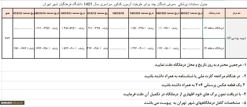 لیست درمانگاه برای معاینه پزشکی پذیرفته شدگان 2