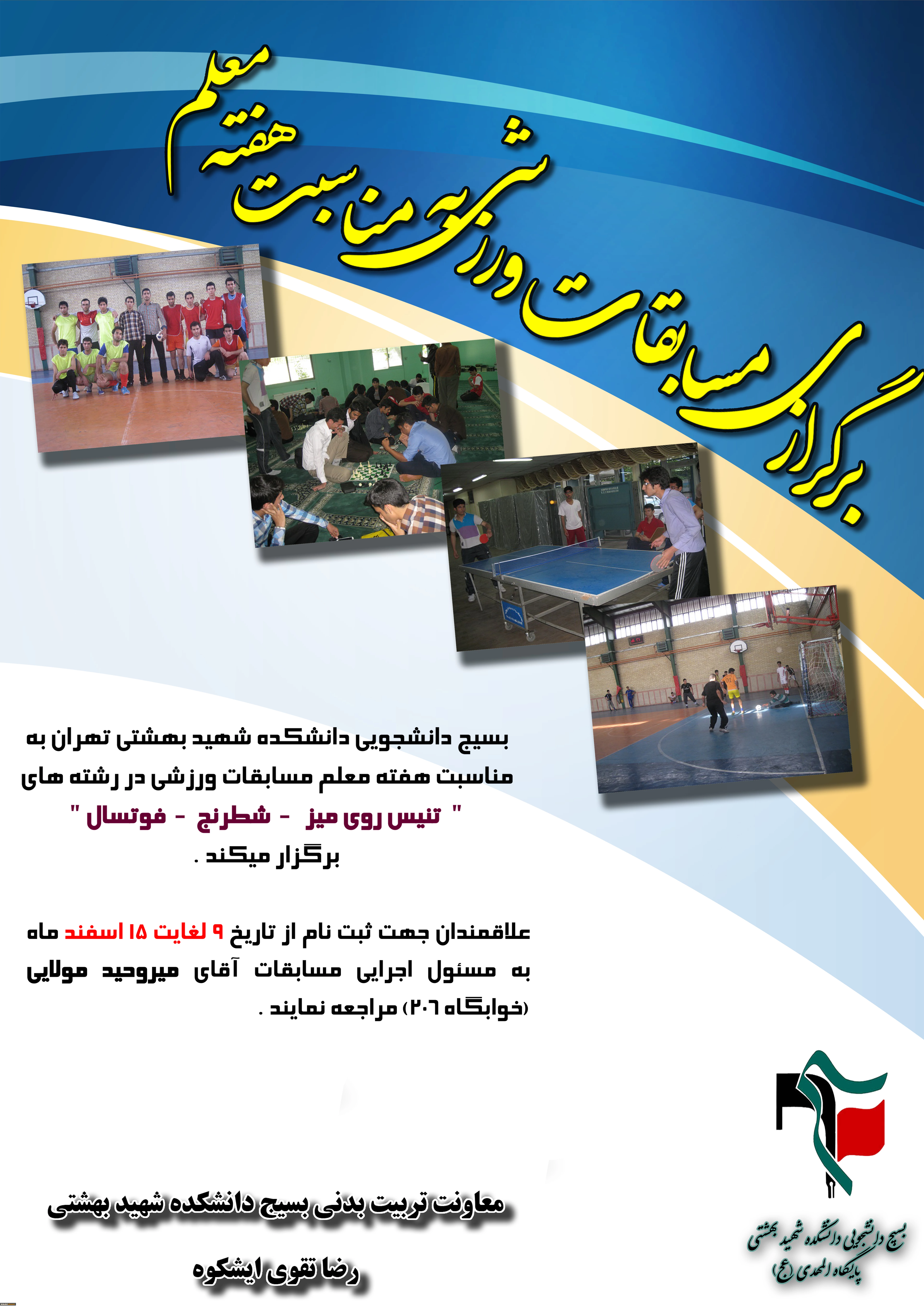 امتیاز دهید : آعاز ثبت نام مسابقات ورزشی دانشجو معلمان مرکز آموزش عالی بهشتی شنبه 9 اسفند 1393 ساعت 16:07