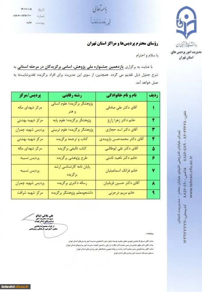 انتخاب سرکار خانم دکتر زهرا زارع، عضو هیئت علمی مرکز آموزش عالی شهید بهشتی- به عنوان پژوهشگر برتر (علوم پایه) در یازدهمین جشنوارۀ ملی پژوهش و فناوری (۱۴۰۱) 2